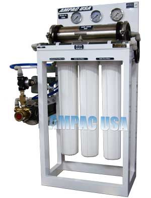 The AMPAC USA Tower™ Series design is optimized for Free Standing Application The five models; 100 GPD, 200 GPD, 300 GPD and 400 GPD all occupy the same very compact footprint. This allows flexibility in accommodating the limited space available in most commercial utility equipment locations. Quick connect tube fittings on all system ports further simplifies installation and service. Most importantly, all AMPAC USA Tower™ Series models incorporate the most reliable combination of proven reverse osmosis hydraulic design and state of the art Thin Film Membrane Elements to provide the long-term performance expected by commercial users. The welded Aluminum Frame with the Aluminum Diamond Plate allows easy access to all major system components.