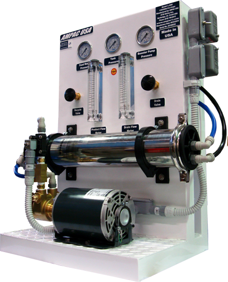 The AMPAC USA L™ Series of Commercial Reverse Osmosis 1000 GPD | APRO1000 Water Purifiers are the result of 28 years experience with the needs and requirements of commercial pure water users. This includes restaurants, coffee stores, convenience stores, microbreweries, supermarket produce and food preparation operations, misting and humidification systems, car wash facilities, and many other businesses that must have consistently high-quality water for their daily operations. The key factors of reliability, serviceability, and consistent performance with minimum user intervention are achieved in the solid design of the AMP{AC USA USA L™ Series systems. Powder Coated Welded Aluminum is used to build our frames, Stainless Steel pressure vessels and fastening hardware to provide the structural strength and corrosion resistance appropriate for a commercial appliance.