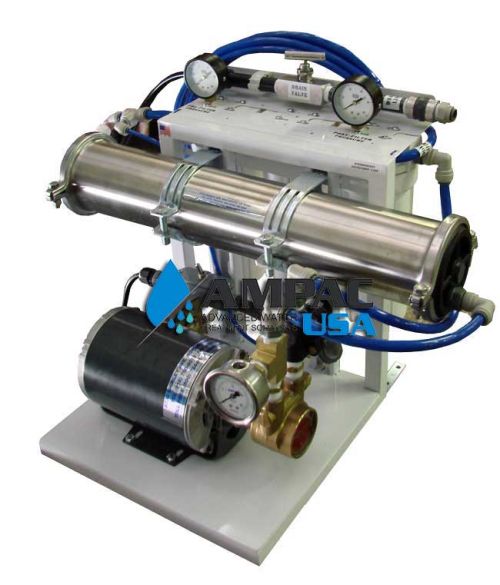 The AMPAC USA L™ APRO Series design is optimized for Free Standing Application The Three models; 500GPD, 800GPD, 1,000GPD all occupy the same very compact footprint. This allows flexibility in accommodating the limited space available in most commercial utility equipment locations. Quick connect tube fittings on all system ports further simplifies installation and service. Most importantly, all AMPAC USA L™ Series models incorporate the most reliable combination of proven reverse osmosis hydraulic design and state of the art Thin Film Membrane Elements to provide the long-term performance expected by commercial users. The welded Aluminum Frame with the Aluminum Diamond Plate allows easy access to all major system components. This 800 Gallons RO System features: